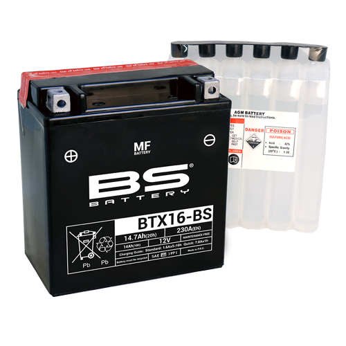 Thông số kỹ thuật của bình ắc quy BS Battery BTX16-BS - Thương hiệu: BS Battery - Mã sản phẩm: BTX16-BS - Loại ắc quy: Ắc quy khô miễn bảo dưỡng (MF - Maintenance Free) - Điện áp: 12V - Dung lượng: 14Ah - Dòng khởi động lạnh (CCA): 230A - Công nghệ: AGM (Absorbent Glass Mat) - Kích thước: 150mm (dài) x 87mm (rộng) x 161mm (cao) - Trọng lượng: Khoảng 5kg Ưu điểm của bình ắc quy BS Battery BTX16-BS Miễn bảo dưỡng - Bình ắc quy BTX16-BS thuộc dòng ắc quy khô AGM, có khả năng tự duy trì mức điện dịch bên trong mà không cần châm nước hay bảo dưỡng thường xuyên. Điều này giúp người sử dụng tiết kiệm thời gian và chi phí bảo trì. Hiệu suất mạnh mẽ - Nhờ vào công nghệ AGM, BTX16-BS cung cấp dòng điện ổn định, giúp xe khởi động nhanh chóng và duy trì hiệu suất tốt ngay cả trong điều kiện thời tiết khắc nghiệt Độ bền cao - Bình ắc quy này có tuổi thọ dài hơn so với các loại ắc quy truyền thống, giúp giảm chi phí thay thế và bảo dưỡng. Chống rò rỉ và an toàn - Với thiết kế kín hoàn toàn, ắc quy BTX16-BS không rò rỉ axit, đảm bảo an toàn khi sử dụng và thân thiện với môi trường. Chất lượng cao cấp Được phát triển theo quy trình sản xuất tiên tiến và được thiết kế theo quy trình kiểm soát chất lượng nghiêm ngặt, cơ sở sản xuất BS BATTERY tuân thủ các tiêu chuẩn và chứng nhận quốc tế cao nhất như: Bình ắc quy BS Battery BTX16-BS phù hợp với nhiều dòng xe máy và mô tô phổ biến trên thị trường, gồm: - BMW: K1600 Bagger, K1600GT, GTL, R1200RT - Honda: XL1000V Varadero - Kawasaki: VN1500-D, E, N Vulcan Classic, VN1500-G, J, L, R, Vulcan Nomad, Drifter, VN1500-P Vulcan Mean Streak, VN1600-A Vulcan Classic, D, Nomad, VN1600-B Vulcan Mean Streak, VN1700 Voyager, Vaquero, VN2000-A Vulcan, ZR1100 - Suzuki: Marauder, Boulevard M95, VL1500 Boulevard C90 Cách lắp đặt và bảo quản bình ắc quy BTX16-BS - Trước khi lắp đặt, đảm bảo xe đã tắt máy và tháo chìa khóa - Xác định vị trí đặt ắc quy trong xe - Kết nối dây điện đúng cực (+) và (-) theo hướng dẫn của nhà sản xuất - Đảm bảo các đầu cực được siết chặt để tránh rung lắc và ảnh hưởng đến hiệu suất của ắc quy Cách bảo quản - Không để ắc quy trong tình trạng hết điện quá lâu, nên sạc định kỳ nếu không sử dụng trong thời gian dài - Giữ sạch các cực ắc quy để tránh hiện tượng ô xi hóa - Lưu trữ ở nơi khô ráo, thoáng mát, tránh ánh nắng trực tiếp