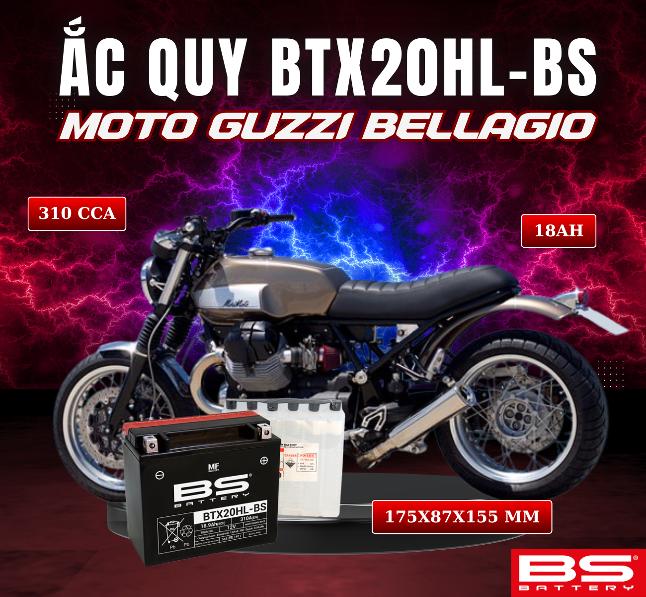 ẮC QUY BS BTX20HL-BS 310CCA MOTO GUZZI BELLAGIO (175x87x155 mm)