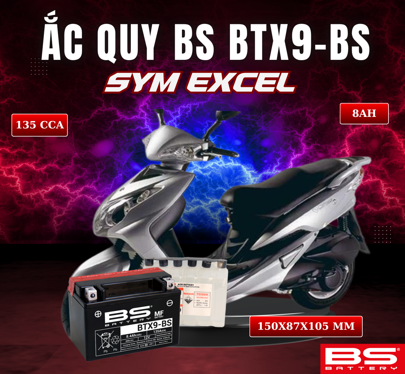 BÌNH ẮC QUY BS BATTERY BTX9-BS 135CCA SYM EXCEL (150 x 87 x 105 mm)
