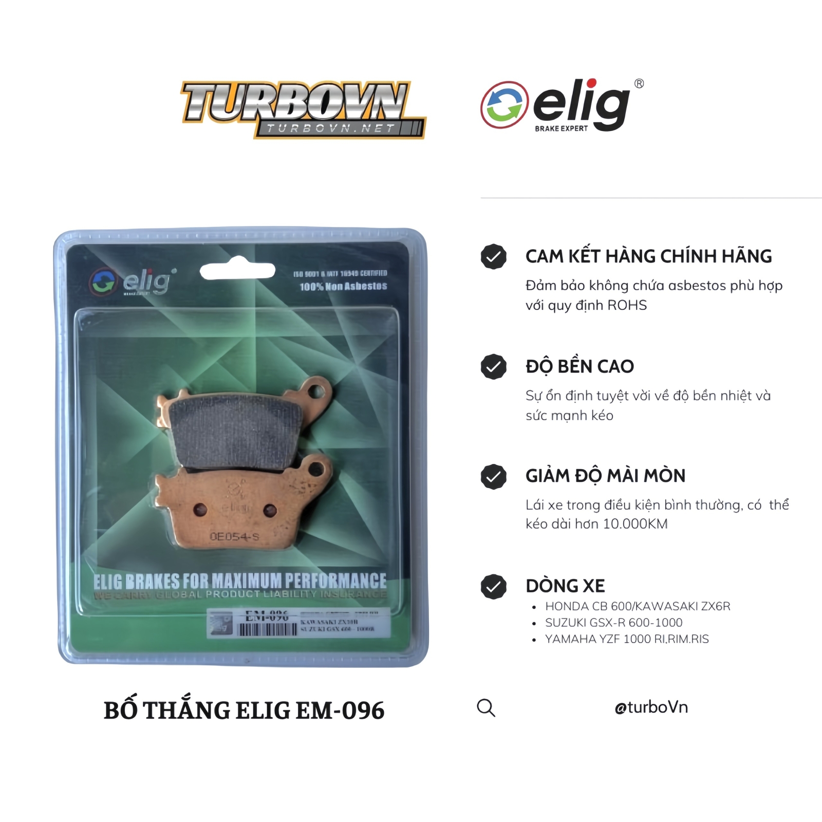 • Độ bền cao - chịu được sự mài mòn tốt (khoảng từ 17.000-18.000km cho một bộ bố thắng Elig)